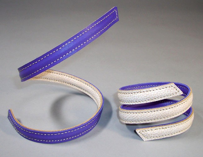 アイボリーの革と、水色のステッチを